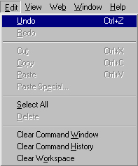 Рис. 5.19. Меню Edit Назначение указанных команд и операций уже обсуждалось. Отметим лишь, что команда Clear Command Window очищает окно командного режима работы и помещает курсор в верхний левый угол окна. Однако все определения, сделанные в течение стертых таким образом сессий, сохраняются в памяти компьютера. Для очистки экрана используется также команда clc, вводимая в командном режиме.