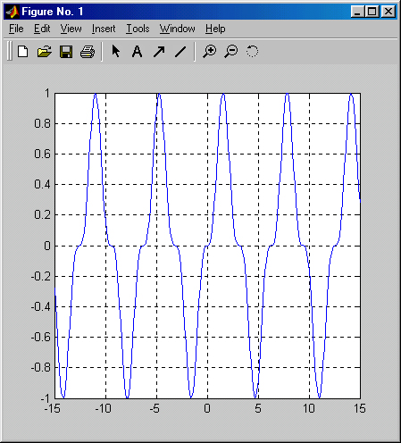 Рис. 5.22. Исполнение файла-сценария из командной строки Для запуска файла-сценария из командной строки MATLAB достаточно указать его имя в этой строке. Рис. 5.22 поясняет это. Обратите внимание на команду grid on, исполняемую после запуска созданного файла. Эта команда наносит на график сетку из точечных линий. Файл-функция отличается от файла-сценария прежде всего тем, что созданная им функция имеет входные параметры, список которых указывается в круглых скобках. Используемые в файле-функции переменные являются локальными переменными, изменение значений которых в теле функции никоим образом не влияет на значения, которые те же самые переменные могут иметь за пределами функции. Иными словами, локальные переменные могут иметь те же имена (идентификаторы), что и глобальные переменные (хотя правила культурного программирования не рекомендуют смешивать имена локальных и глобальных переменных). В дальнейшем мы рассмотрим этот вопрос более подробно, а пока вернемся к теме данного урока — описанию интерфейса компонентов системы MATLAB. Панель инструментов редактора и отладчика Редактор имеет свое меню и свою инструментальную панель. Внешний вид инструментальной панели показан на рис. 5.23. По стилю данная панель похожа на панель инструментов окна командного режима работы, но имеет несколько иной набор кнопок.