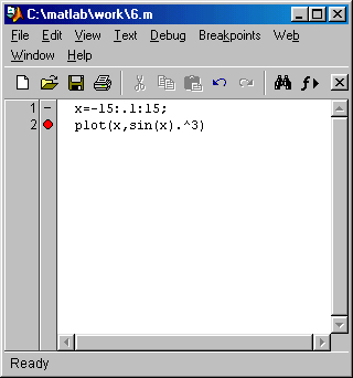 В MATLAB 6.0, что уже описывалось, набор команд меню View существенно расширен, и теперь с помощью этого меню можно существенно менять вид пользовательского интерфейса. Основы редактирования и отладки m-файлов Интерфейс редактора/отладчика m-файлов Для подготовки, редактирования и отладки m-файлов служит специальный многооконный редактор. Он выполнен как типичное приложение Windows. Редактор можно вызвать командой edit из командной строки или командой New > M-file из меню File. После этого в окне редактора можно создавать свой файл, пользоваться средствами его отладки и запуска. Перед запуском файла его необходимо записать на диск, используя команду Filе > Save as в меню редактора.