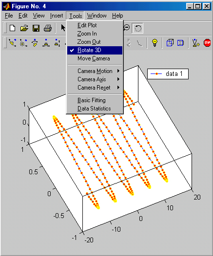 Панель инструментов камеры обзора Отличительной особенностью окна графики в версии MATLAB 6.0 стало появление второй инструментальной панели со средствами форматирования трехмерной (3D) графики. Эта панель (она видна на рис. 5.25 под основной панелью инструментов) выводится командой View > Camera Toolbar. Эта панель управляет некоторой воображаемой фотокамерой (или просто камерой), с помощью которой как бы наблюдается объект. Кнопки имеют наглядные изображения, поясняющие действия кнопок. В связи с этим их подробное описание лишено смысла — проще опробовать их в действии. Действия кнопок панели инструментов камеры обзора продублированы в меню Tools (Инструменты) — на рис. 5.25 оно представлено в открытом состоянии. Состав команд указанного подменю в версии MATLAB 6.0 существенно изменен и обновлен. Теперь в нем имеются следующие команды: