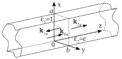 с компонентами $k_{0z}$, $k_{0x}=\pm \frac{l\pi}{a}$ и $k_{0y}=\pm \frac{m\pi}{b}$. При отражении и преломлении