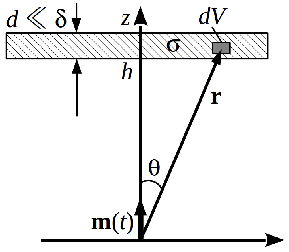 \begin{equation*} \begin{array}{l} E_{\alpha}(r,\theta,t)\cdot 2\pi r \sin \theta = -\frac{1}{c}\int \frac{dB_r(r,\theta',t)}{dt}dS=\\\\ =-\frac{i m_0 \omega e^{i \omega t}}{c}\int\limits_0^{\theta} 2\frac{\cos\theta'}{r^3}2\pi r^2 \sin\theta' d\theta' = -2\pi \frac{i\omega m_0}{cr}\sin^2\theta {\e}^{i\omega t}, \end{array} \end{equation*} откуда \begin{equation*} \begin{array}{l} \hat{E}=E_{\alpha}(r,\theta,t)= \frac{i\omega m_0}{с r^2}\sin\theta {\e}^{i(\omega t+\pi)},\\\\ \hat{j}=\sigma E(r,\theta,t)= \sigma \frac{i\omega m_0}{с r^2}\sin\theta {\e}^{i(\omega t+\pi)}. \end{array} \end{equation*} Интенсивность тепловыделения в кольце, усредненная по времени, равна (учитываем, что для тонкого диска $z\approx h,\; r\approx\frac{h}{\cos\theta}, dr\approx\frac{d}{\cos\theta}$ и элементарный объем $dV=2\pi r^2\sin\theta dr d\theta= (2\pi d\cdot h^2) \frac{\sin\theta}{\cos^3\theta} d\theta$) \begin{equation*}\label{2012_13_3ex_pb7_eq3} \begin{array}{l} \langle Q \rangle = \frac{1}{2} \Re \int \hat{E}\hat{j}^*dV= \sigma \left(\frac{\omega m_0}{с}\right)^2\int\limits_{0}^{\theta_0} \frac{\sin^2\theta \cos^4\theta}{h^4} \pi d\cdot h^2 \frac{\sin\theta}{\cos^3\theta} d\theta=\\\\ =\pi d\cdot\sigma \left(\frac{\omega m_0}{с}\right)^2\int \limits_{0}^{\theta_0} \frac{\sin^3\theta \cos\theta}{h^2} d\theta=\pi d \cdot \sigma \left(\frac{\omega m_0 }{с h}\right)^2 \frac{\sin^4\theta_0}{4}. \end{array} \end{equation*} * Поток вектора $\left(-\frac{1}{c}\frac{d\vec{B}}{dt}\right)$ можно вычислять по любой поверхности, натянутой на контур, но удобно это делать по сферическому сегменту радиса $r$. Учтем при этом, что $r$-компонента магнитного поля равна $$ B_r=\left(-\frac{\vec{m}}{r^3}+3\frac{(\vec{m}\cdot \vec{r})\vec{r}}{r^5}\right)\cdot \vec{e}_r =3\frac{(m r \cos\theta) r}{r^5}-\frac{m \cos\theta}{r^3} =\frac{2m}{r^3}\cos\theta. $$ Симметрия задачи позволяет вычислить $E_{\alpha}$, вообще избегая интегрирования. Для этого запишем уравнение Максвелла через вектор-потенциал: $$ \text{rot}\vec{E}=-\frac{1}{c}\frac{d \text{rot}\vec{A}}{dt}, $$ откуда $$ E_{\alpha}(r,\theta,t) = -\frac{i\omega}{c}A_{\alpha}(r,\theta,t)= -\left|\frac{i\omega}{c} \frac{[\vec{m}\times\vec{r}]}{r^3}\right|= -\frac{i\omega}{c} \frac{m_0 \sin\theta }{r^2}{\e}^{i\omega t}. $$ |