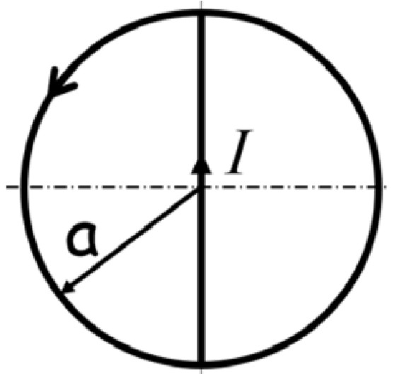 | Ток $I$, текущий по прямому проводу, в точке O расщепляется на две