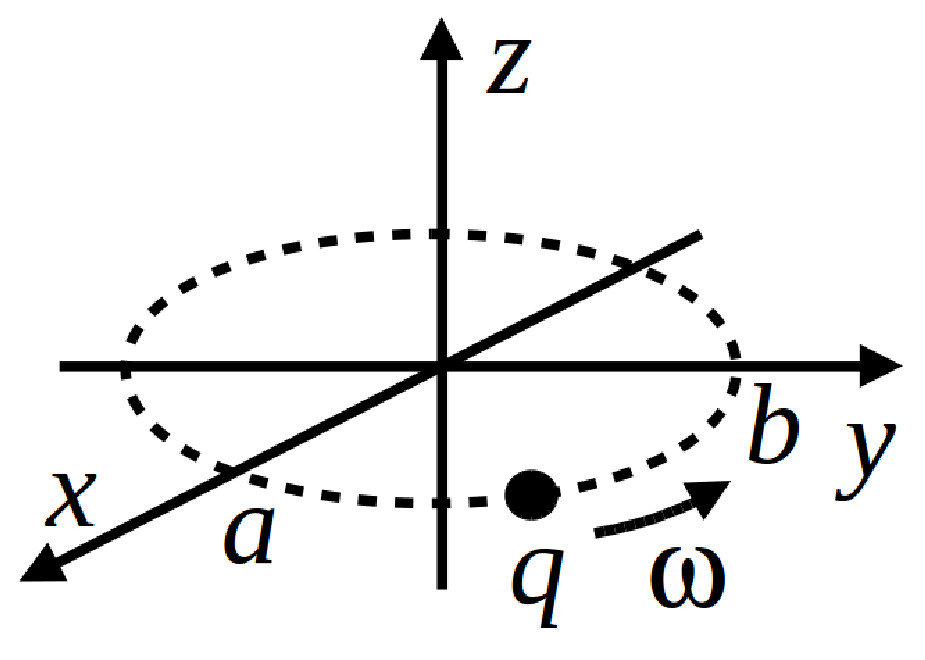| Нерелятивистская частица с зарядом $q$ движется по эллиптической траектории согласно