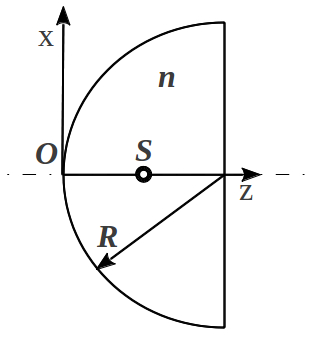 | Параксиальный пучок света проходит через полусферическую линзу радиуса $R$ с показателем преломления $n$.