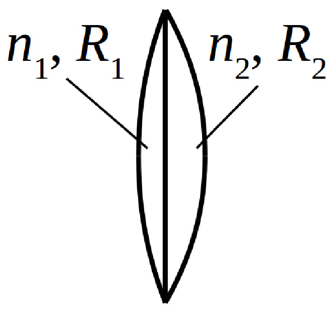 и коэффициентами преломления $n_1$, $n_2$ соответственно. Найти фокусное расстояние линзы. |