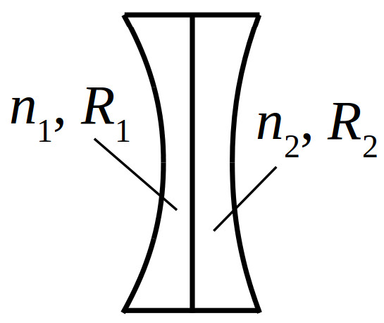 | Двояковогнутая тонкая линза составлена из двух плосковогнутых линз с радиусами кривизны $R_1$, $R_2$