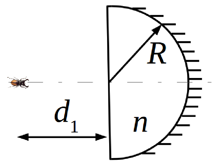 | Жук находится на расстоянии $d_1$ = 5 см слева от плоской поверхности оптической системы в виде стеклянного полушара радиуса $R$ = 5 см с посеребренной сферической поверхностью.