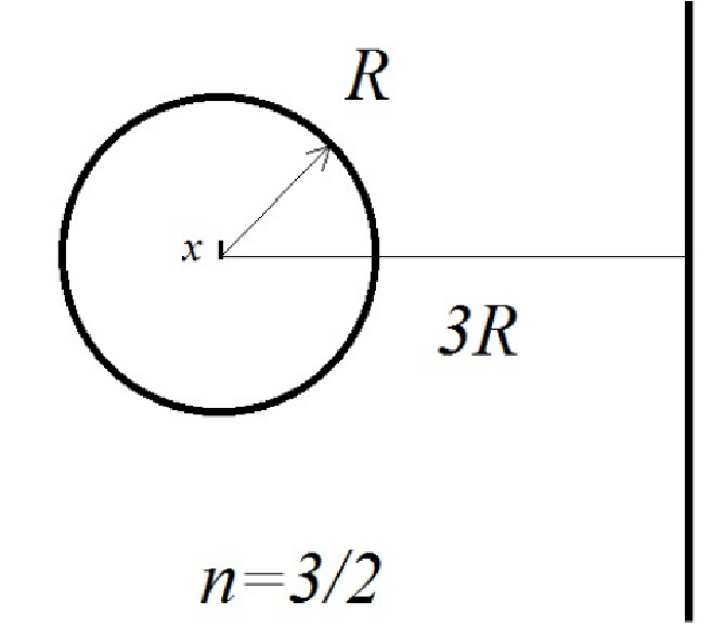 | В полубесконечном пространстве, заполненном стеклом с показателем преломления 3/2 находится воздушная полость радиуса $R$.
