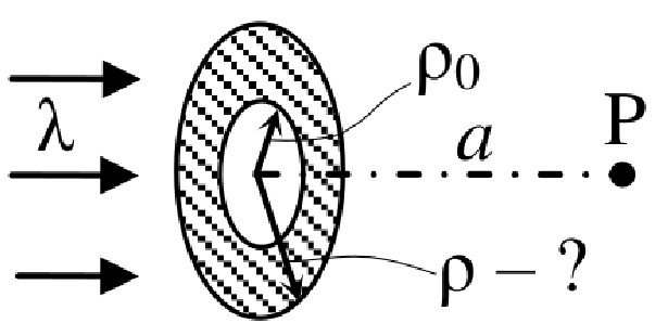 где $a$ – расстояние до точки наблюдения $P$. Найти минимальный внешний радиус кольца $\rho$,