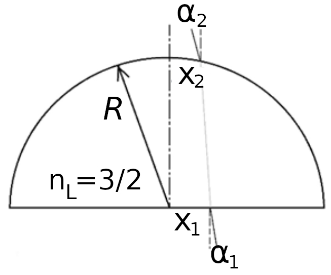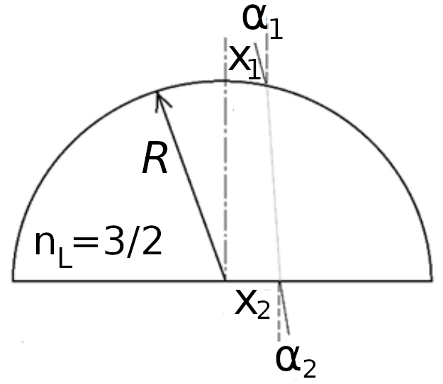 $n_L=3/2$) под малым углом $\alpha_1 \ll 1$ на расстоянии $x_1\ll R$ от оптической оси (см. рисунок). Найти, под каким углом $\alpha_2$ и на каком расстоянии $x_2$ луч выйдет из полушария. |