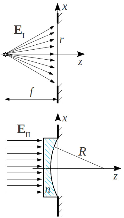 в плоскости диафрагмы (см. рисунок). $\lambda_I=\lambda_{II}$. Показатель преломления линзы $n$, радиус кривизны $R$.