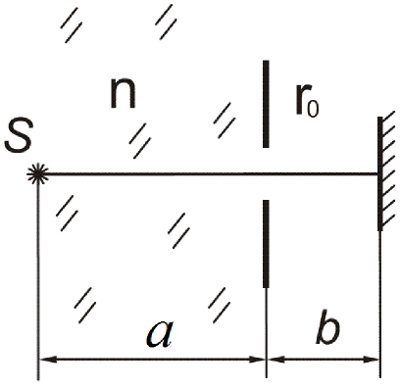 | Монохроматический с частотой $\omega$ точечный источник $S$ находится на расстоянии $a$ от непрозрачного экрана