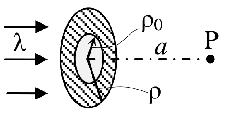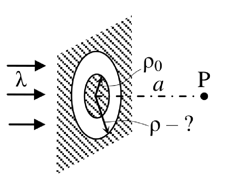 $\rho_0=\sqrt{\frac{\lambda a}{2}}$ (см. рисунок). Определите интенсивность в точке наблюдения. |