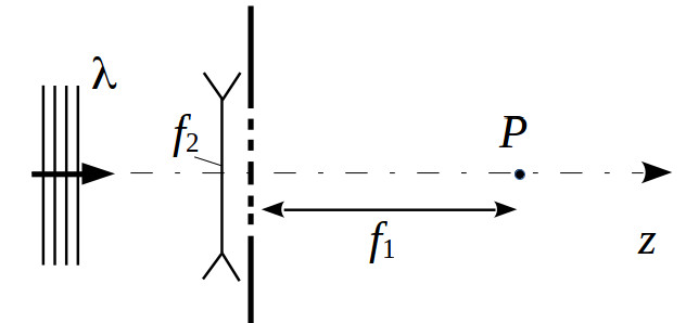 система непрозрачных концентрических колец, закрывающих нечетные зоны Френеля для точки $P$, находящейся на оптической оси на расстоянии $f_1$ от отверстия. Перед отверстием поместили рассеивающую линзу с фокусным расстоянием $f_2 > f_1$. Определить положение фокуса образованной оптической системы. |