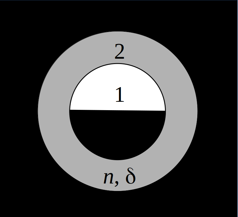 | Плоская монохроматическая волна интенсивностью $I_0$ и с длиной волны $\lambda$ падает по нормали на плоский непрозрачный экран с отверстием в виде полукруга, радиусом в 1-ю зону Френеля, и кольца, занимающего 2-ю зону Френеля (для точки наблюдения за экраном). На кольцо наложена прозрачная пластина толщиной $\delta$ с показателем преломления $n$. Найти интенсивность в точке наблюдения. Отражением от пластины пренебречь. |
