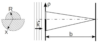 полудиска $x$ амплитуда волны обратится в 0 на расстоянии $b$ $\left(b\gg 2R\sqrt{\frac{2R}{\lambda}}\right)$ по нормали от центра полудисков. |