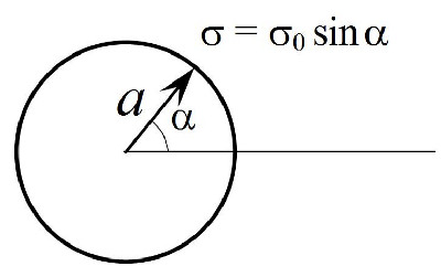 радиуса $a$ поверхностные заряды распределены по закону: $\sigma = \sigma_{0}\sin\alpha $.