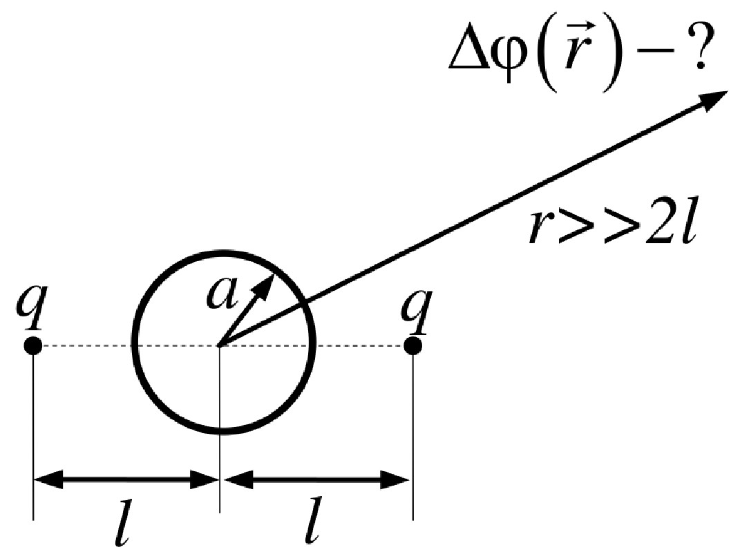 радиуса $a$ ($a<l$) расположен точечный диполь $\vec{p}=p\vec{e}_z$ (см. рис.).