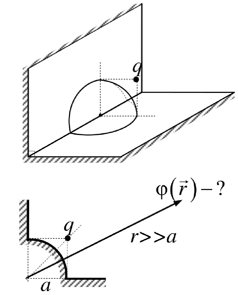 выступа, на расстоянии $a$ от каждой из граней. Найти первый неисчезающий член в разложении потенциала