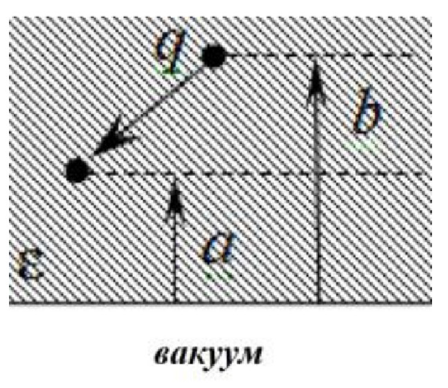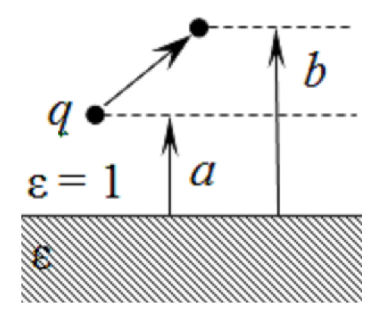 нижнее – вакуум. Найти работу, которую надо совершить, чтобы переместить точечный заряд $q$ из одной точки в другую. Начальная точка отстоит от границы раздела на расстояние $b$, конечная – на $a$. |