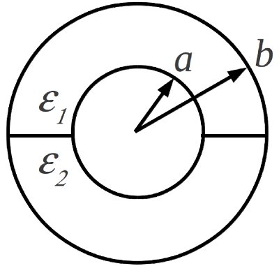 | Сферический конденсатор с обкладками радиуса $a$ и $b$ заполнен диэлектриком, проницаемость