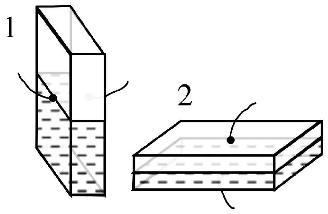 (наибольшие по площади) грани напылены металлические электроды, и к ним подключен измеритель емкости. В двух положениях, показанных на рисунке, проводятся измерения емкости. Отношения показаний равно $C_{I}/C_{II} = 4/3$. Найдите диэлектрическую проницаемость $\varepsilon$ жидкости. Поперечные размеры двух металлизированных граней много больше расстояния между ними. |