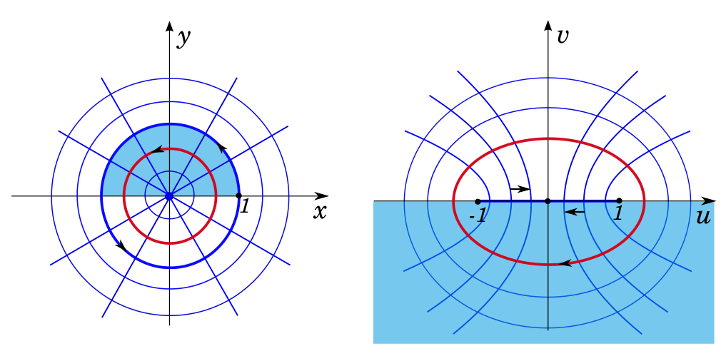 Лучи $\arg z = \alpha$ ($\alpha\ne\frac{\pi k}{2}$) переходят ветви гиперболы $$ \dfrac{u^2}{\cos^2\alpha} - \dfrac{v^2}{\sin^2\alpha} = 1. $$ Итак, окружностям $|z| = R$ соответствуют софокусные эллипсы $$ \dfrac{4u^2}{(R + 1/R)^2} + \dfrac{4v^2}{(R - 1/R)^2} = 1 $$ (окружности $|z| = 1$ - отрезок $v =0, -1\leq u \leq 1$). Лучам соответствуют софокусные гиперболы (лучу $\arg z = 0$ - луч $v = 0, u\geq 1,$ лучу $\arg z = \pi$ - луч $v = 0, u\leq -1;$ лучам $\arg z = \pm \pi/2$ - ось $u = 0$).