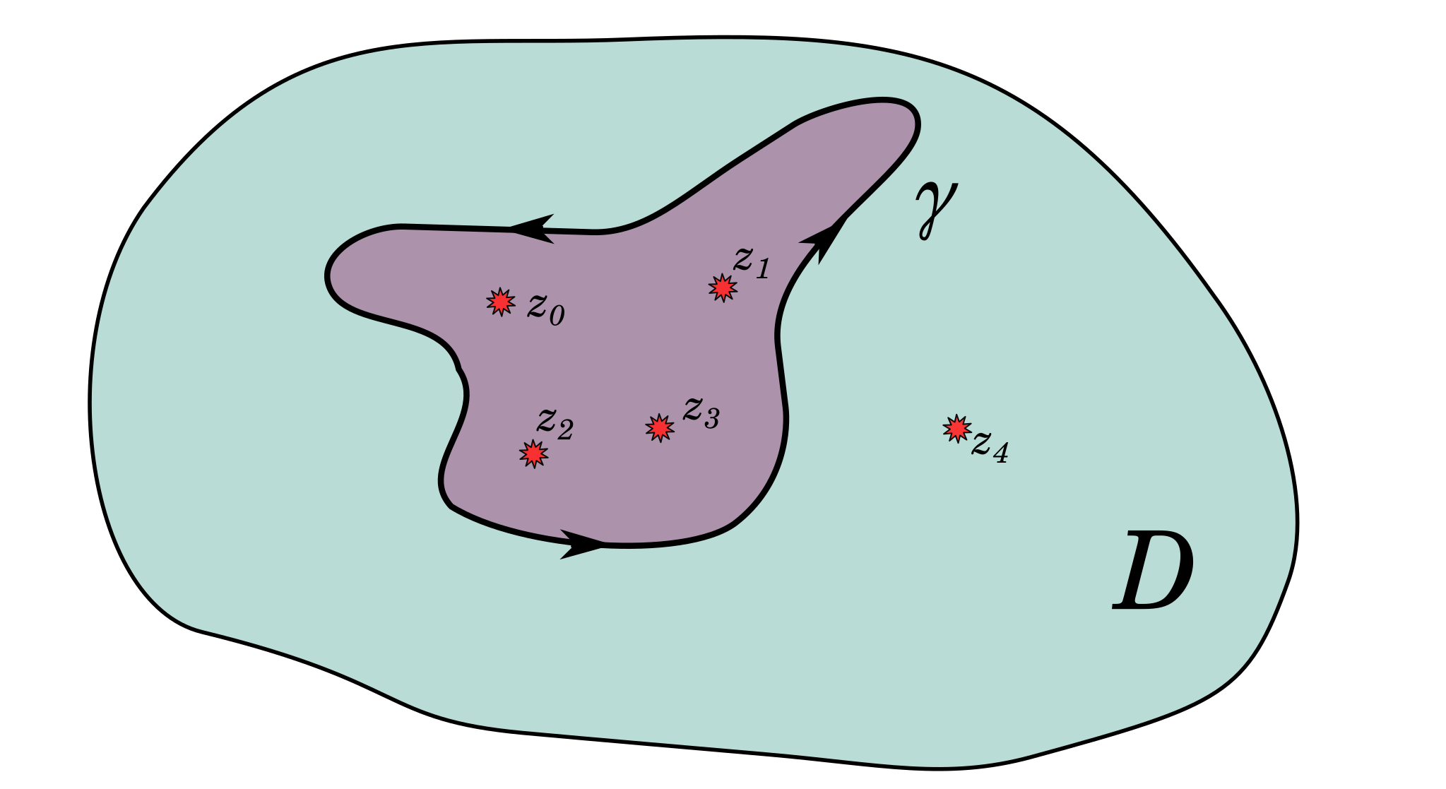 Основная теорема теории вычетов. Пусть $f$ - голоморфна в $D\subset\mathbb C$, за исключением изолированных особых точек $\{z_j\}$, $\gamma$ - простая замкнутая кусочно-гладкая кривая, не содержащая особых точек $\{z_j\}$. Тогда $$ \int\limits_{\gamma} f(z)\, dz = 2\pi i\sum\limits_j\Res\limits_{z=z_j} f(z), $$ где суммирование ведётся по всем точкам $z_j$, находящимся внутри.