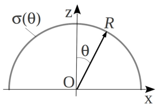 | Полусфера радиуса $R$ заряжена с поверхностной плотностью $\sigma(\theta)