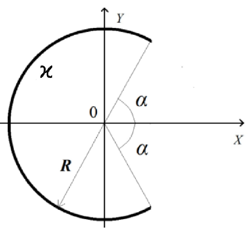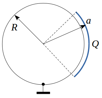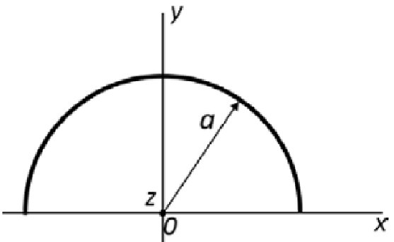 | Тонкое полукольцо радиуса $a$, равномерно заряженное зарядом $q$, расположено в плоскости (x,y), как показано на рисунке.
