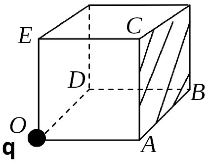 | Заряд $q$ расположен в вершине куба, как показано на рисунке. Найти поток вектора напряженности