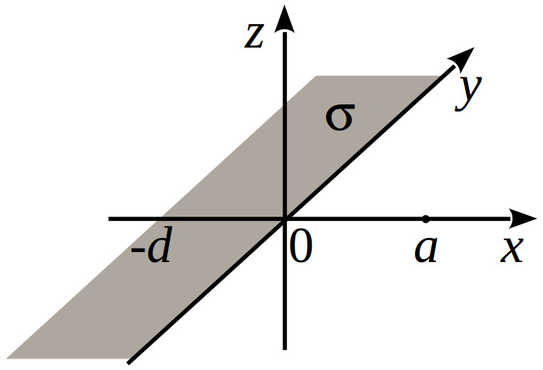 | Бесконечный плоский слой толщины $2a\,\, (-a\leqslant z\leqslant a)$ заряжен с объёмной плотностью заряда $\rho(z)=\rho_0\frac{z}{a}$.