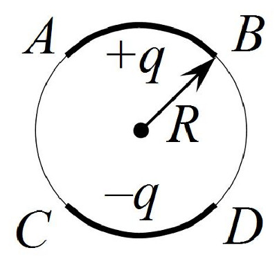 | Участки $AB$ и $CD$ тонкого непроводящего кольца радиуса $R$ равномерно (с постоянной линейной плотностью) заряжены зарядом $+q$ и $-q$ соответственно.