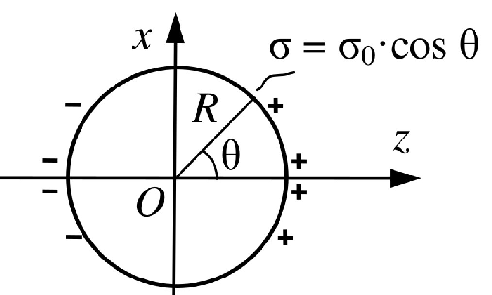 | Шар радиуса $a$ заряжен с объёмной плотностью $\rho(\theta) = \rho_0 \cos \theta$,