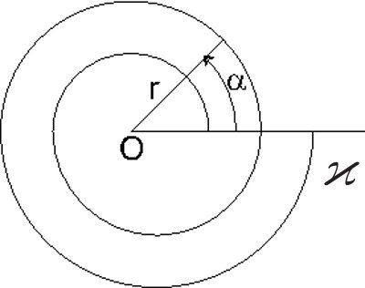 | Плоская спираль, описываемая уравнением $r=a \exp(b\alpha)$, имеет $N$ полных оборотов (см. рисунок,