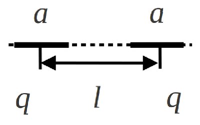 | Два отрезка длиной $a$, заряженные равномерно по длине зарядом $q$ каждый, лежат на одной прямой. Найти силу взаимодействия
