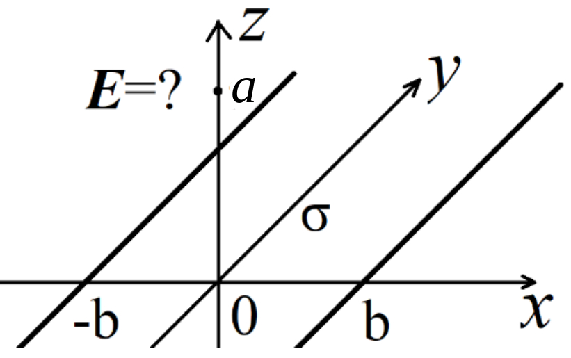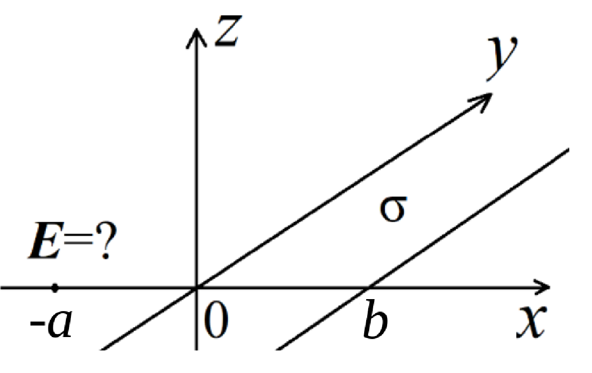 | Бесконечная по координате $y$ полоса $(z=0,\,\, 0\leqslant x\leqslant b)$ однородно заряжена с поверхностной плотностью заряда $\sigma$.