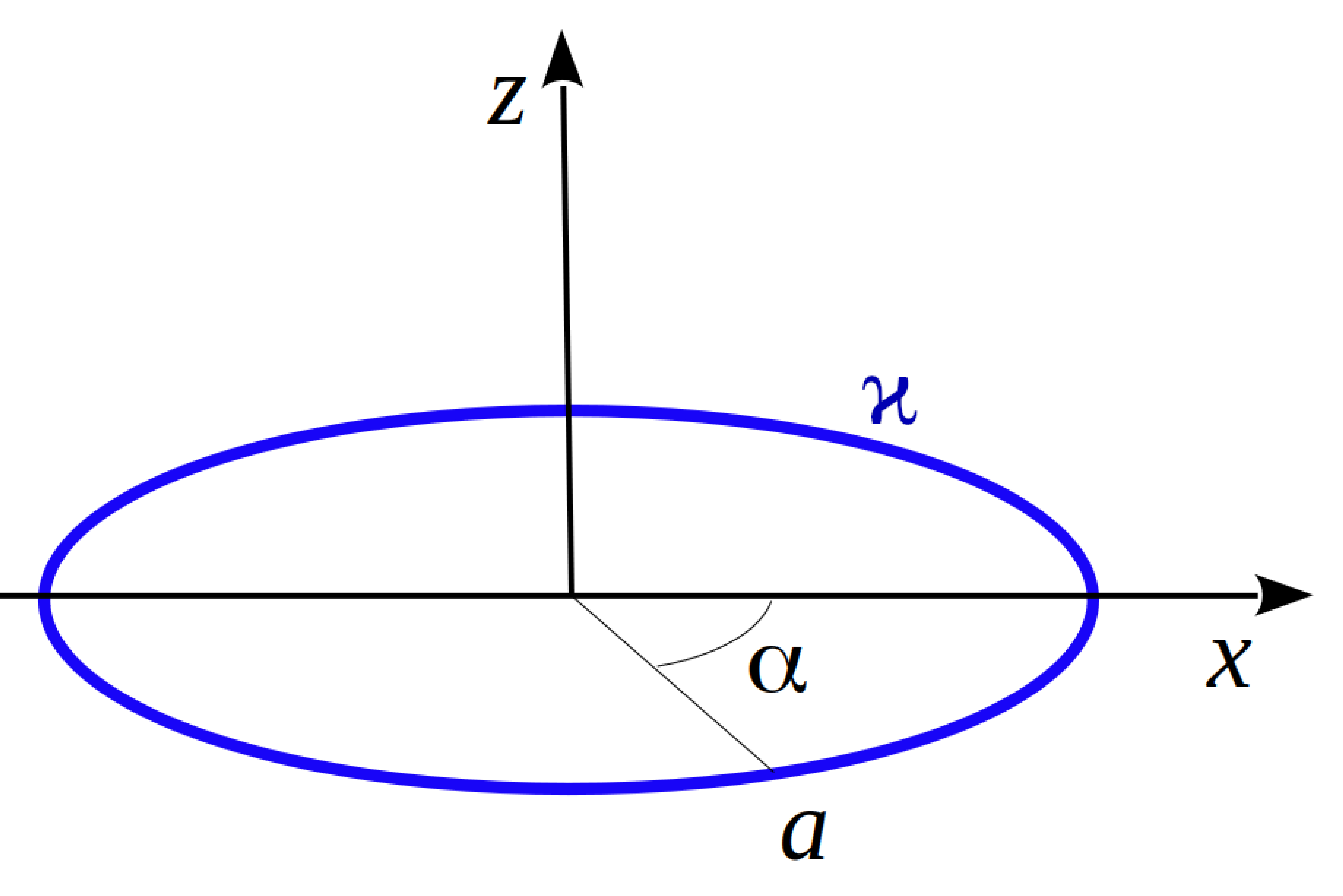 | Тонкое кольцо радиуса $a$ заряжено с линейной плотностью $\varkappa(\alpha)=\frac{\alpha}{2\pi}\varkappa_0$, $0\leqslant \alpha < 2\pi$. Найти потенциал на оси кольца как функцию $z$ (см. рисунок). |