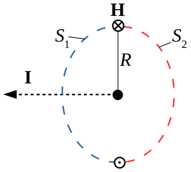 | Рассмотрим источник, испускающий $\alpha-$частицы в одном направлении вдоль прямой. Пусть эквивалентный ток заряженных частиц постоянен во времени и равен $I$. Тогда задача обладает аксиальной симметрией и для определения магнитного поля в пространстве можно воспользоваться теоремой Стокса. В качестве контура возьмем окружность радиуса $R$ около полупрямой с током с центром в источнике, а в качестве поверхности, натянутой на контур, в первом случае – любую поверхность, расположенную слева от контура (синий пунктир на рисунке), а во втором – справа от него (красный пунктир на рисунке). Согласно теореме Стокса магнитное поле вдоль контура в первом случае задается уравнением