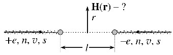 | На два маленьких проводящих шарика, закреплённых на расстоянии $l$ друг от друга, направлены узкие пучки заряженных частиц. Плотность частиц в пучках $n$, скорость частиц $v$, площадь сечения пучков $s$, заряды частиц в пучках $+e$ и $–e$, соответственно. Пучки распространяются по оси, соединяющей центры шариков, в противоположных направлениях. При попадании на шарики, заряды накапливаются на них. Определите напряжённость магнитного поля $\vec{H}(\vec{r})$ в плоскости, проходящей посередине между шариками перпендикулярно оси, на расстоянии r от оси. Отталкиванием частиц от заряженных шариков пренебречь. |
