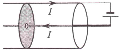 Коаксиальный кабель, жила и обмотка которого имеют бесконечную проводимость и радиусы $r_1$ и $r_2$, замкнут накоротко подвижным проводящим диском. Найти силу, действующую на этот диск, когда по кабелю течет ток $I$. Указать направление этой силы.