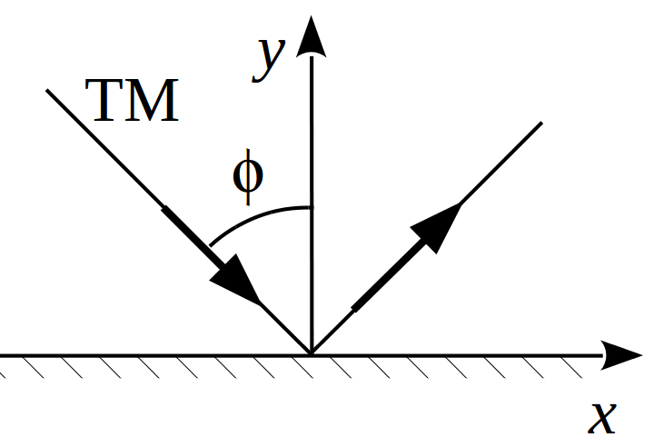 | TE-волна $\vec{E}_0=\vec{E}_{0m}\e^{i(\vec{k}\vec{r}-\omega t)}$ падает под углом $\phi=45^{\circ}$