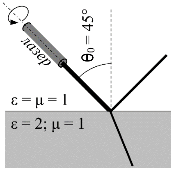 проницаемостью $\varepsilon = 2$ ($\mu$ = 1) под углом $\theta_0 = 45^{\circ}$. Найти отношение минимального и максимального коэффициента отражения по интенсивности $\frac{R_{min}}{R_{max}}$ при повороте лазера вокруг своей оси. |
