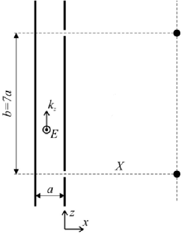 Расстояние между плоскостями $a=\frac{\lambda_0}{\sqrt{2}}$, где $\lambda_0$ – длина волны в свободном пространстве.