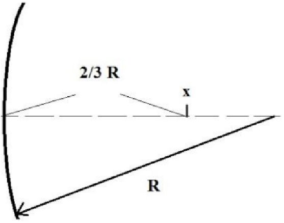 | Предмет с размером $x$ расположен на расстоянии $2R/3$ от вогнутого