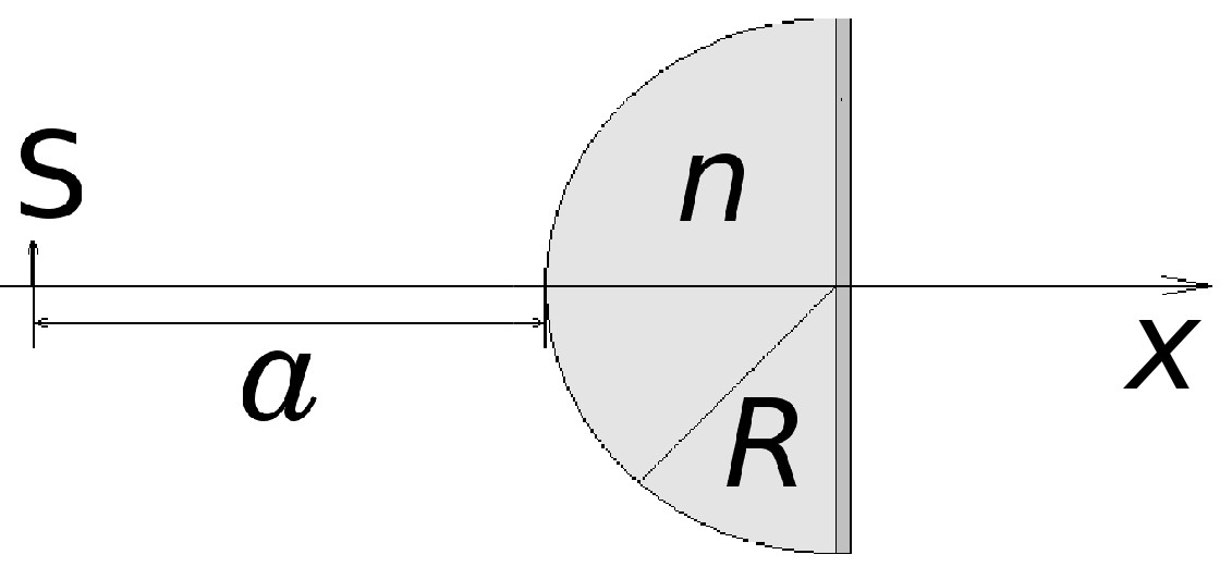| Параксиальный пучок света проходит через полусферическую линзу радиуса $R$ с показателем преломления $n$.