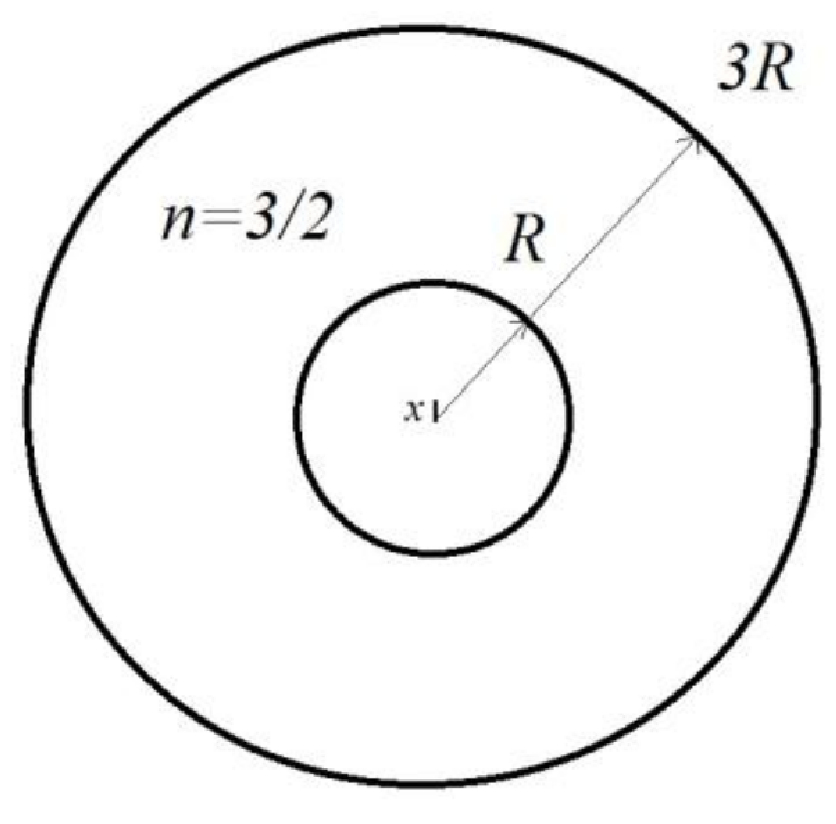 | В полубесконечном пространстве, заполненном стеклом с показателем преломления 3/2 находится воздушная полость радиуса $R$.