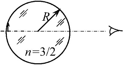 | Луч входит в стеклянное полушарие радиуса $R$ (показатель преломления