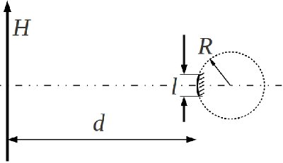 без зазоров с ее границами (это не так на схематическом рисунке). Рост человека $H$, радиус шара $R$, размер зеркального